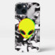 Trippy Alien Camo iPhone Case by BigTexFunkadelic, featuring a gray and white background with a yellow psychedelic alien head in the center.