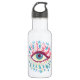 Psychedelic eye water bottle with a colourful illustration of a weird blue eye with big curled pink eyelashes, light blue tears flowing everywhere and many pink and green elements - extensions of the eyelashes.