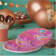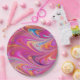 Paper plates with a cool trippy psychedelic design. Pink, orange and hints of blue all swirling around. Retro hippie vibe.