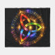 Rainbow-colored luminous triquetra symbol surrounded by a mystical circle adorned with esoteric glyphs, on a starry cosmic background.