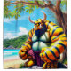 This shower curtain has an artsy troll creature on it.