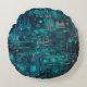 Genius AI Tron Circuit Board Round Polyester Throw Pillow 16", a Tron Blue board with copper lines that connect electronic parts to make devices work. The pillow's plush filling ensures comfort and support, making it the perfect accent piece for any sofa or bed.