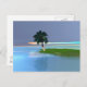 Postcard with my digital artwork of a peaceful island scene with palm trees surrounded by a blue sea.