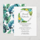Exotic summertime beach floral wedding guest details card featuring abundant tropical greenery in a silver geometric frame customisable to your event specifics.