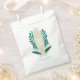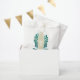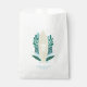 Surfs up! Tropical surf themed baby shower thank you favour bag with a natural wood grain surfboard and tropical leaves in shades of aqua and green.