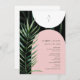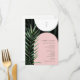 Blush pink and white arches over dark palm leaf background. Vertical monogram at top over white arch. Grey text over pink arch with watercolor palm leaf at left.