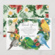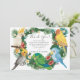 Whimsical thank you card featuring illustration of tropical watercolor greenery and adorable exotic parrots