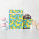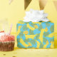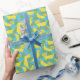 Have you ever seen wrapping paper that's more bananas? It's a dog! It's a banana! It's dogs made out of bananas! These yellow dachshund style dogs made out of fruit are accompanied by green palm leaves and set against a bright blue background.