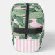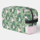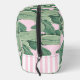 This cosmetic bag has a trendy Palm Beach aesthetic with banana leaves on a pink background and a monogram on a notched white square. The sides have a pink and white stripe pattern near the bottom.
