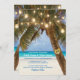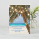 Destination wedding invitations featuring a tropical paradise beach setting with a lush palm tree, your initials engraved in a carved heart and twinkle string lights.