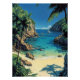 A secluded island cove, framed by towering palm trees and pristine white sands. The clear turquoise water gently laps at the shore, with small waves rolling in. In the distance, a small boat drifts peacefully, adding to the sense of calm. This serene, private paradise evokes the feeling of a hidden retreat, untouched and tranquil, offering a moment of escape into nature's untouched beauty.