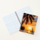 A peaceful tropical beach with palm trees, and a sailboat in the distance silhouetted against a setting sun creates a beautiful spiral notebook.