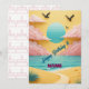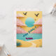This vibrant and dreamy birthday card design features a paper-cut style tropical beach scene. A golden sandy path leads to the turquoise ocean under a gradient teal sun and soft pink clouds. Silhouettes of soaring birds add movement against the bright yellow sky. Perfect for beach lovers and anyone who enjoys tranquil coastal vibes. Ideal for birthday greetings, summer-themed parties, or inspiring travel lovers with a touch of whimsy.