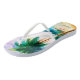 Beach Blue Green Flip Flops with Watercolor Beach, Sand, tropical palm tree design and pink flamingos. Use personalise this template option to change the text on both sides. | Use customise further option to change the text style, size and colour if required.