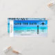 A tropical beachside image is the background for this Boarding Pass Destination wedding Save the Date.