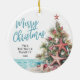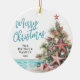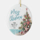 The bottom of the design shows soft sand and gentle teal blue ocean waves, creating a relaxed shoreline scene. "Merry Christmas" appears at the top in a mix of blue and black fonts, using a cheerful blend of script and serif typography. Your family name or custom text is displayed below the tree, with space to add a year for a personal touch. The same design is printed on both sides, making it a charming keepsake from every angle.