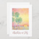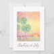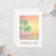 Christmas in July party invitation with a script typography and tropical beach design with palm trees at sunset. With red customisable lettering, you can add your own information. A festive way to add a touch of summer to your holiday celebration.