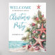 Welcome guests to your holiday gathering with this festive and beachy Christmas party welcome sign. The design features a large green Christmas tree on the right, decorated with orange-red starfish and ornaments. At the base of the tree is soft sand and gentle teal blue ocean water, adding a warm and tropical feel.