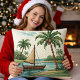 Bring a unique twist to your holiday décor with this tropical beach Christmas throw pillow, featuring a charming cross-stitch style design of palm trees, a sailboat, and a serene coastal landscape. Perfect for those who love warm-weather vibes even during the festive season, this pillow blends holiday spirit with relaxing island aesthetics.