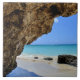 Designed with a scenic nature photograph. Beautiful turquoise blue sea with a sandy beach. A big brown rock provides some shade from the bright blue sky.
