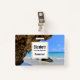 Name tag with a scenic nature photograph. Beautiful turquoise blue sea with a sandy beach. A big brown rock provides some shade from the bright blue sky.