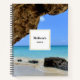 Spiral notebook with a scenic nature photograph. Beautiful turquoise blue sea with a sandy beach. A big brown rock provides some shade from the bright blue sky.