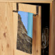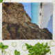 A kitchen towel with a scenic nature photograph. Beautiful turquoise blue sea with a sandy beach. A big brown rock provides some shade from the bright blue sky.