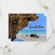 Save the date card with a scenic nature photograph. Beautiful turquoise blue sea with a sandy beach. A big brown rock provides some shade from the bright blue sky.
