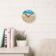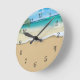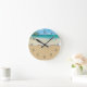 Tropical beach coastal themed wall decor clocks designed with a graphic image of beautiful tropical ocean and sand with classy clock face numbers you can hand on the wall in your home in style.