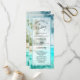 This beautiful wedding program features a beautiful design with a watercolor background of a pristine tropical beach with turquoise waters and palm treel. The text is features elegant script calligraphy with space for the couple's name, wedding date, ceremony, bridal party, and a short thank you. Lovely, stylish, and chic, this program is perfect for a coastal or island destination wedding.