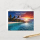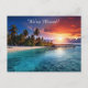 A gorgeous tropical beach with clear, blue water, sand, and palm trees under the setting sun creates a fabulous new address postcard.