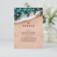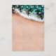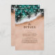 Elegant beach destination wedding information cards featuring a tropical sandy shoreline, ocean waves, romantic palm leaves, string lights, and a modern wedding detail template that is easy to personalise.