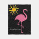 Tropical pink flamingo blanket in a graphic design that includes a bright and cheerful sun, pink flamingo with one let up, and lots of style