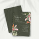 Featuring a modern design with tropical greenery and flowers in muted colours and a touch of rose gold over a dark green background combined with an elegant calligraphy typography, for a chic look.