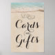 Personalised wedding party sign featuring a summer tropical ocean island background, a vintage sandy beach with two hearts in the shoreline, your initials, and the words "cards and gifts".
