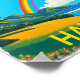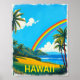This image is a vibrant illustration of a tropical scene in Hawaii. It features a bright blue sky with fluffy white clouds and a colourful rainbow arching across the sky. In the foreground, there are lush green palm trees and tropical plants. The background shows a scenic view of mountains and the ocean, with gentle waves lapping at the shore. The word "HAWAII" is prominently displayed at the bottom in bold yellow letters. The overall style is reminiscent of a vintage travel poster.