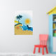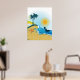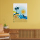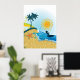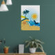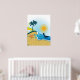 Tropical beach, ocean with surfer poster print, featuring a tropical landscape. There are palm trees and a starfish on the sand beach, a surfer on the waves and a whimsical sun made of circles.