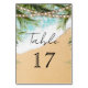 Elegant beach theme wedding table number featuring modern typography against a beautiful beach background.