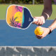 Super cool pickleball paddle featuring a tropical beach scene with a pickleball sunset. Add your custom text to the bottom edge to personalise your paddle - your name, pickleball club name, location, phone number, etc. Whether you're heading out for rec or competitive play, this unique custom paddle will definitely become your favourite - and you're sure to get compliments. A perfect gift for beginners and experienced players alike - get two or more and match with your pickleball partner or other club members.