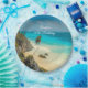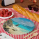 Paper plates with a beautiful photo featuring Tulum, Mexico. Turquoise waters on a sandy shore. Wind swept palm trees blowing in the breeze near a craggy cliff side. Soothing and relaxing.