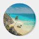 A magnet with a beautiful photo featuring Tulum, Mexico. Turquoise waters on a sandy shore. Wind swept palm trees blowing in the breeze near a craggy cliff side. Soothing and relaxing.