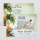 Save the Date postcard featuring your own favourite photo framed by a tropical green turquoise beach scene with palm trees, festive lanterns and colourful exotic flowers. Perfect for a planned beach or destination wedding. (Your photo should automatically rotate to fit the frame).