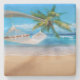 Stone coaster shown with a photo print of a beautiful tropical beach scene.