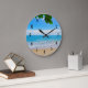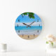 A clock with a landscape photograph of a tropical beach. White sand, azure water and blue sky with tropical leaves along the top.