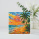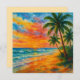 This vivid watercolor painting captures the tranquil beauty of a tropical beach at sunset. Brilliant shades of orange, red, and yellow fill the sky, blending seamlessly into the deep blues of the ocean waves. Tall palm trees frame the foreground, casting subtle shadows over the warm sandy shore. The scene evokes a sense of peace, relaxation, and natural wonder, making it a perfect representation of paradise found.