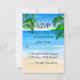 Beach theme Wedding RSVP with tropical blue waters and palm trees. Great wedding RSVP cards for beach or destination weddings. Beach art featuring a sandy beach, palm trees,and tropical blue waters background for your personalised invitation. Matching Invitations, Thank You's, and additional wedding products available.