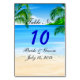 Beach theme Wedding Table number cards with tropical blue waters and palm trees. Great wedding table cards for beach or destination weddings. Beach art featuring a sandy beach, palm trees,and tropical blue waters background for your personalised invitation. Matching Invitations, Thank You's, and additional wedding products available.