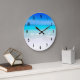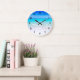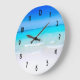 A clock with a sandy tropical beach. A gorgeous turquoise sea in the distance and crystal clear waters caressing a sandy beach. A bright blue sky in the background.
