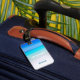 Personalised luggage tag with a sandy tropical beach. A gorgeous turquoise sea in the distance and crystal clear waters caressing a sandy beach. A bright blue sky in the background.