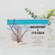 Wedding invitation with a gorgeous photograph. Tropical blue water and foamy surf in the background. A collection of seashells and stems set on a white sandy beach.